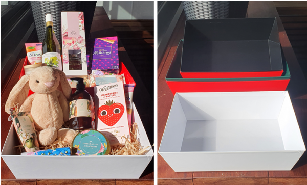 Please Note: All of our gift hampers have a 'stress point' in the corners which may cause cracking during delivery - if this occurs the corners can be taped closed from the inside and are not noticeable once the hampers are filled.